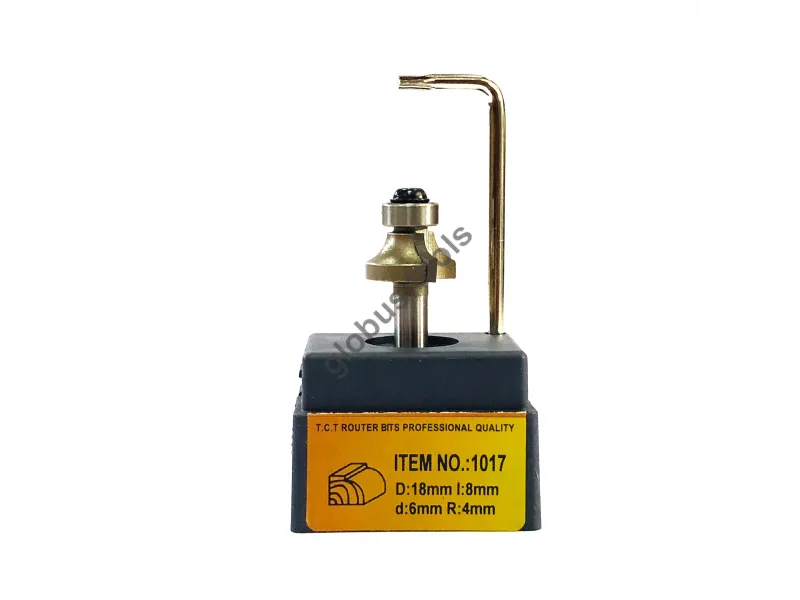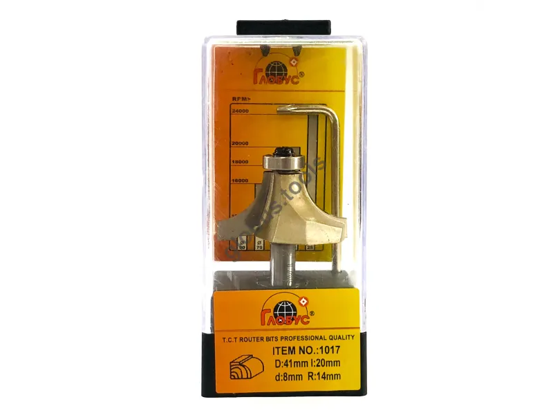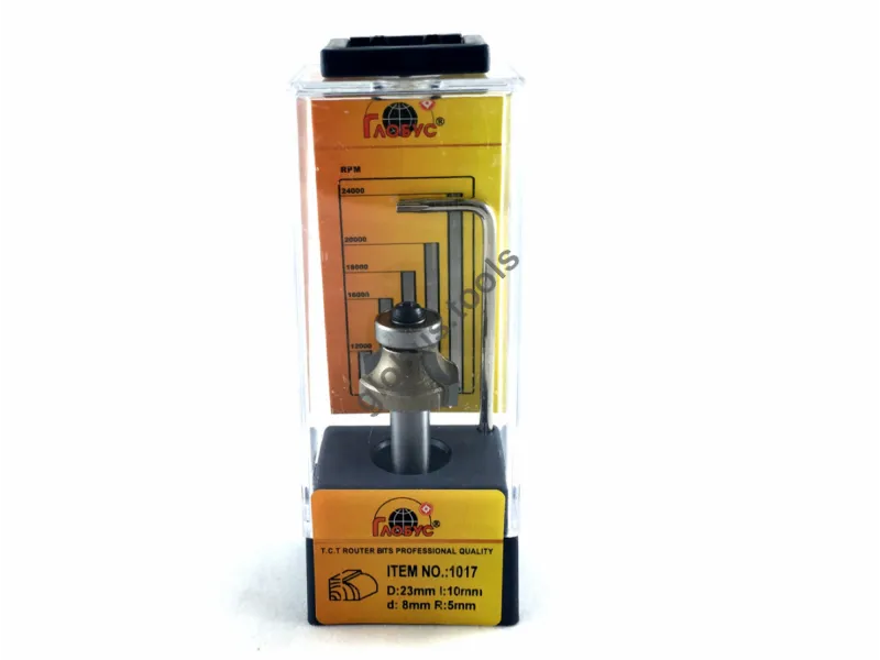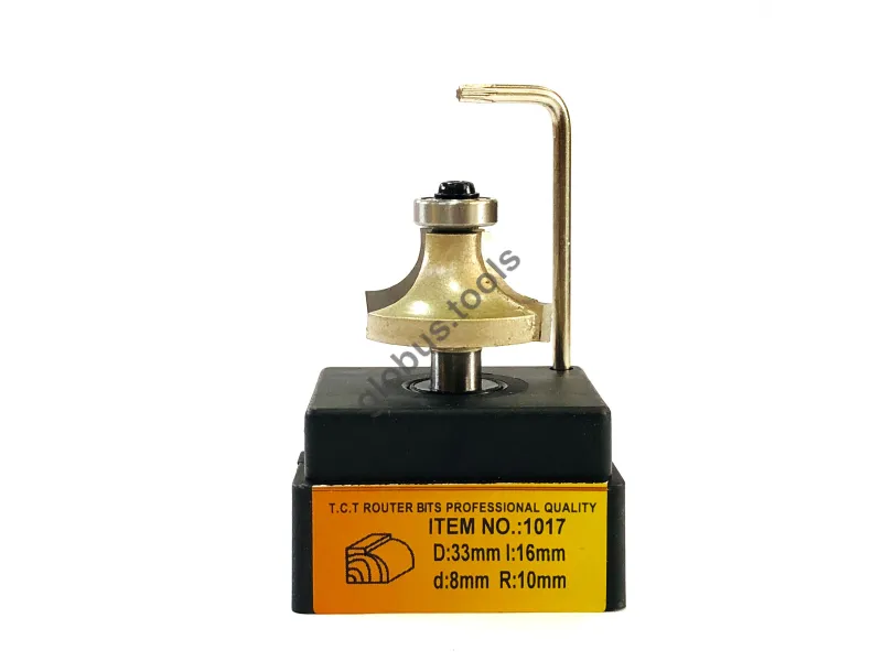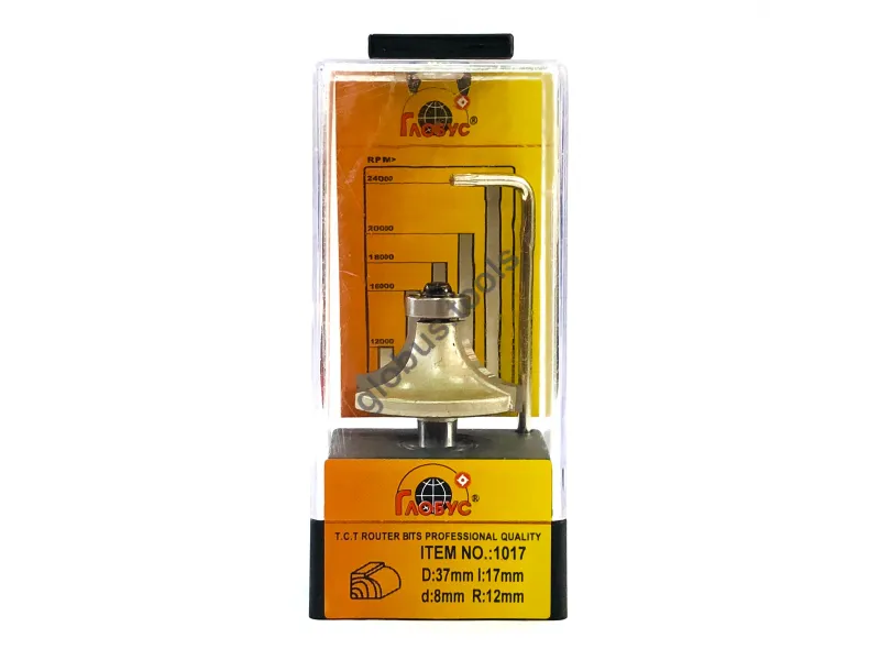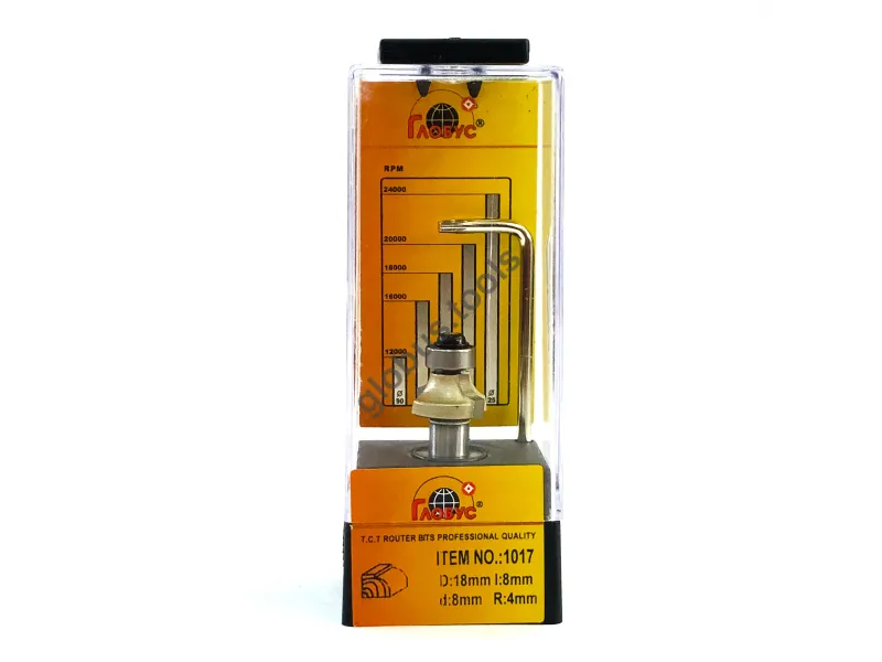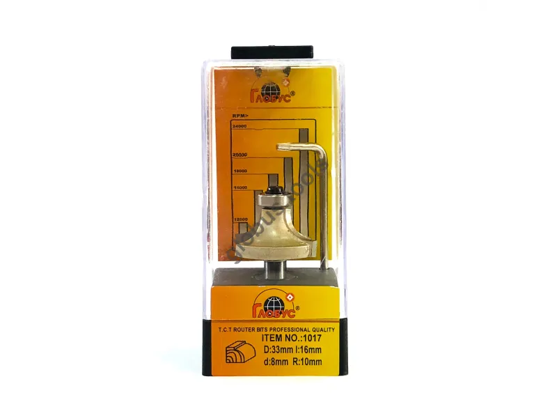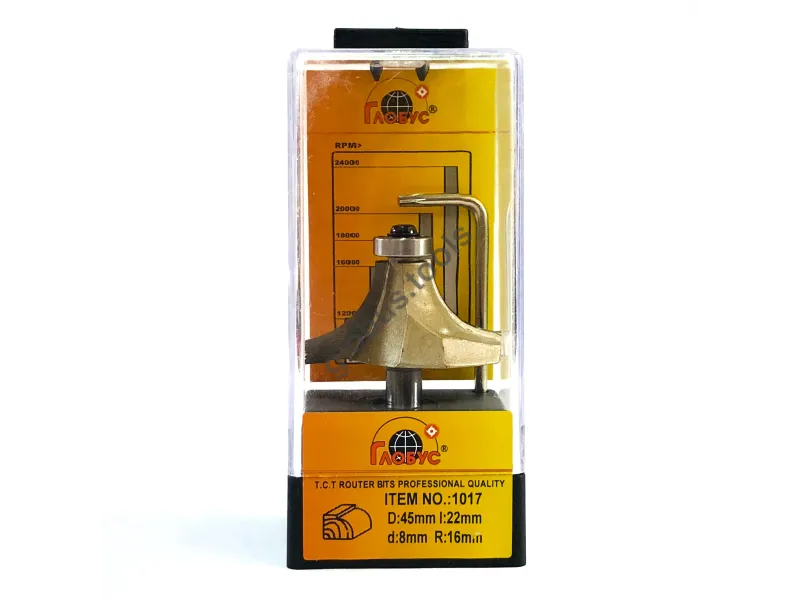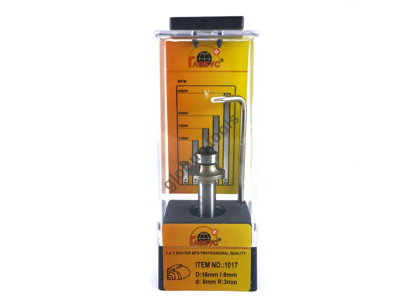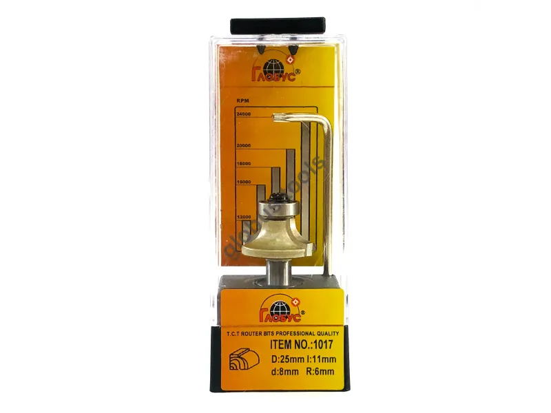 Інструмент серії 1017 бренду Глобус використовується для обробки кромок на прямокутних чи криволінійних дерев'яних деталях. Фреза дозволяє максимально точно заокруглювати кромки і кути столярних виробів чи меблевих заотовок. Фреза Глобус 1017 дозволяє створювати якісні та гарні меблі. Робоча часина має радіуси 1, 1.5, 2, 3, 4, 5, 6, 8, 10, 12, 14, 18, 20, 25 та 30 мм. Хвостовик фрези має діаметр 6, 8 і 12 мм. Нижній підшипник дозволяє м'яко та плавно виконувати тонкі роботи по дереву.Твердосплавні напайки дозволяють фрезерувати деревину різної твердості.